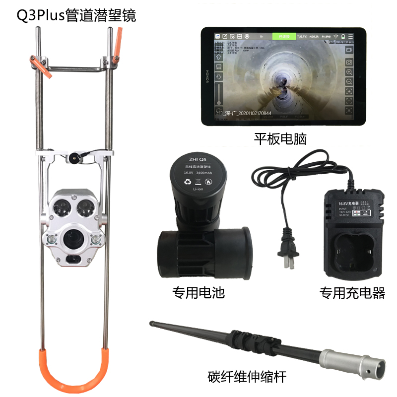 Q3Plus无线高清管道潜望镜,是一款影像快速检测仪,该产品采用一体化设计,包括高清数字摄像系统、特殊照明系统、激光测距、无线数据传输系统、平板控制器、碳纤维伸缩杆和视频处理专用软件。该产品具有高可靠性、功能完善、操作方便等特点。 产品已广泛应用于市政排水管道快速视频勘察,隧道涵洞内部空间状况视频检测,大型容器罐体内部视频检查,槽罐车内部视频检测等;